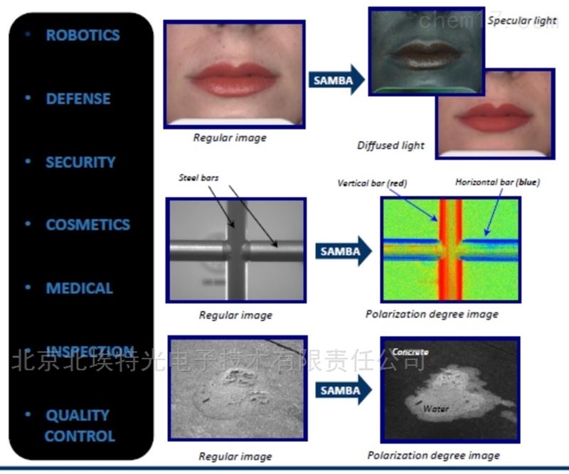 Samba差分偏振相机主要用于主动偏振成像。在可控偏振光源照明条件下,可以对目标物的表面散射特性进行三维测量分析,可作为光泽计等测量皮肤、毛皮、五金工件等的表面光洁度(粗糙度)。